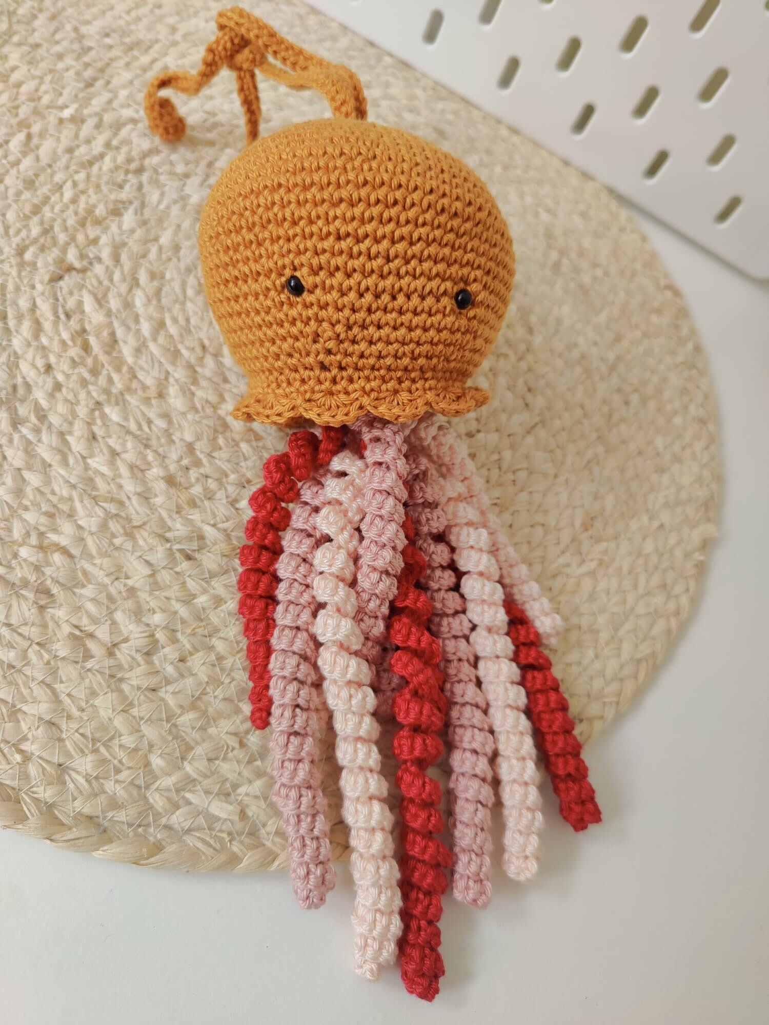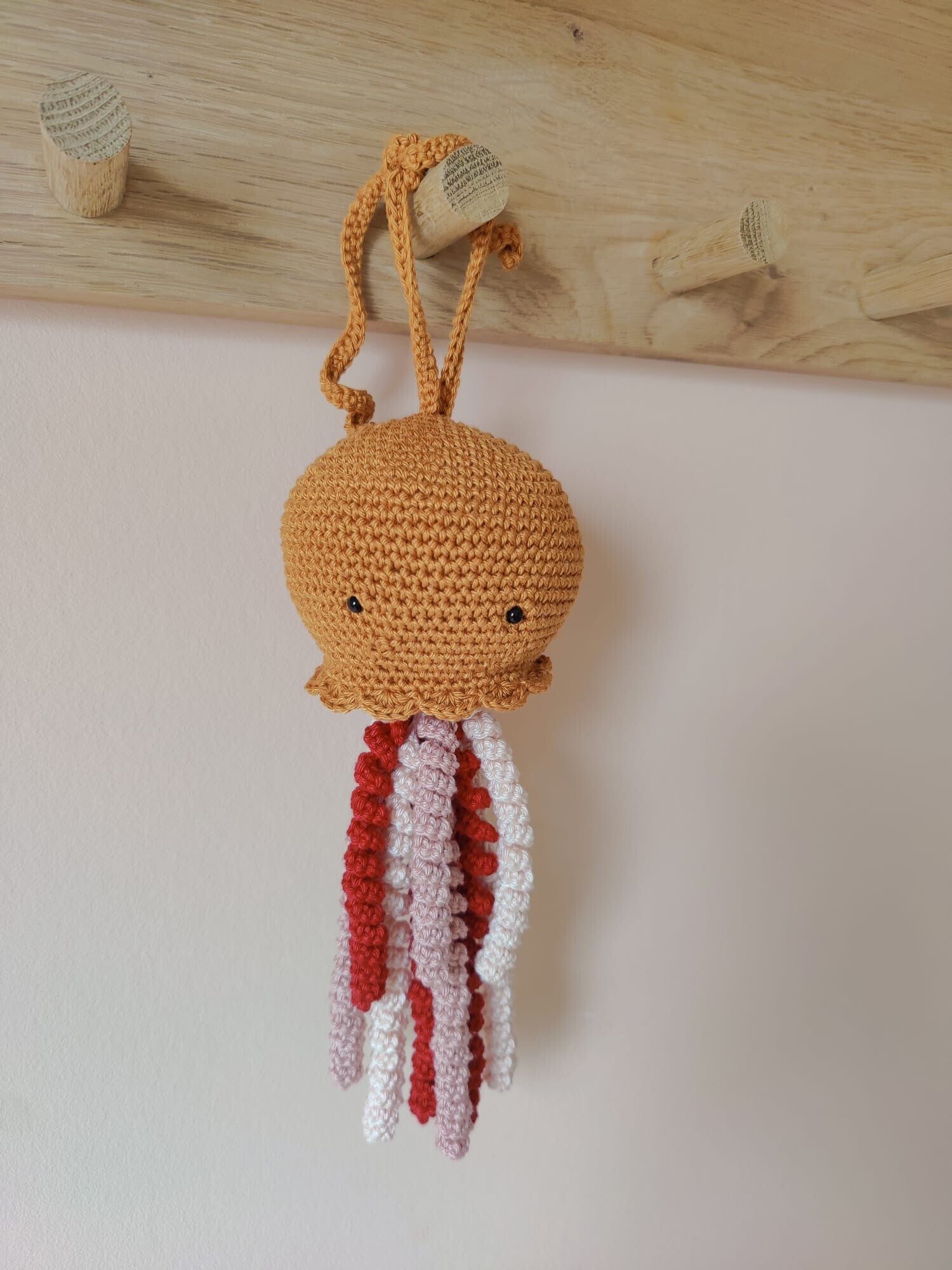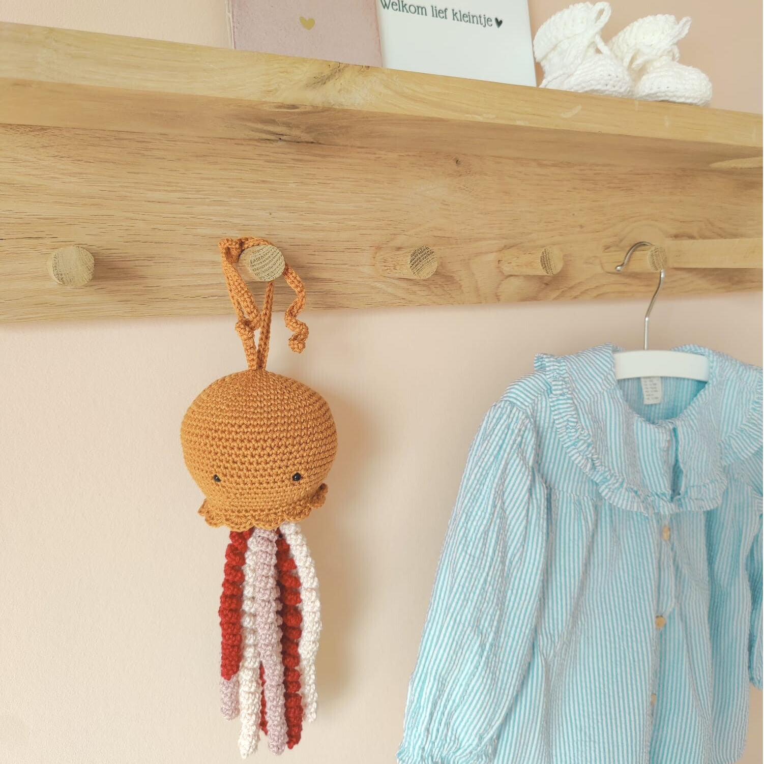 Door het ophangkoord is de octopus makkelijk te bevestigen aan bijvoorbeeld de maxi-cosi, kinderwagen of box.