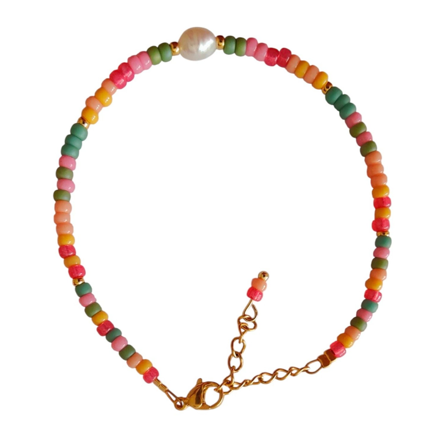 Maak je zomerse outfit af met deze mooie kleurrijke armband. Handgemaakt van prachtige gekleurde kralen. De sluiting is gemaakt van stainless steel en daardoor kleurvast. Als extraatje heeft deze armband een prachtige zoetwaterparel.