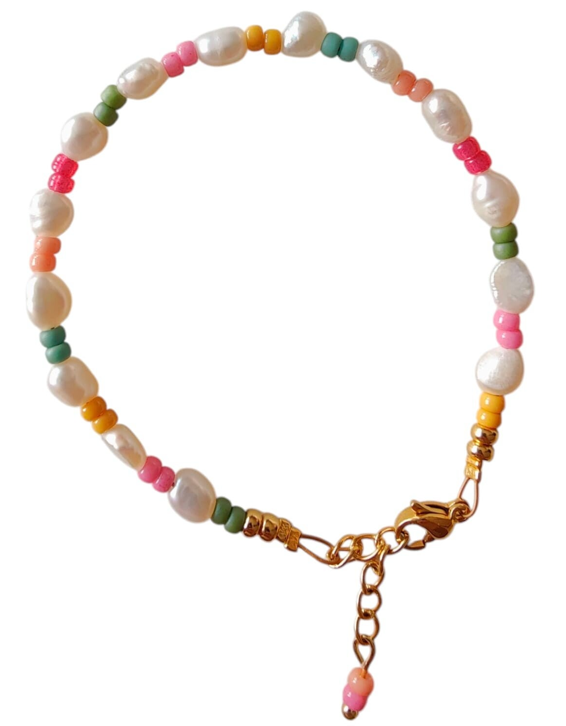 Maak je zomerse outfit af met deze mooie kleurrijke armband. Handgemaakt van prachtige gekleurde kralen. De sluiting is gemaakt van stainless steel en daardoor kleurvast. De echte zoetwaterparels geven de armband een extra zomers tintje.