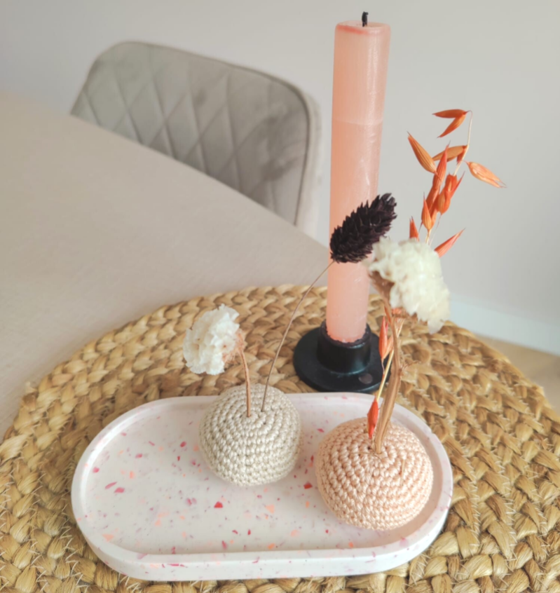 Jesmonite is een composiet poeder en vloeistof. Wanneer je deze met elkaar mengt en in een vorm giet, hardt het uit en kun je de mooiste woonaccessoires maken. Door kleurstoffen te mengen creëer je een eigen unieke kleuren combinatie.