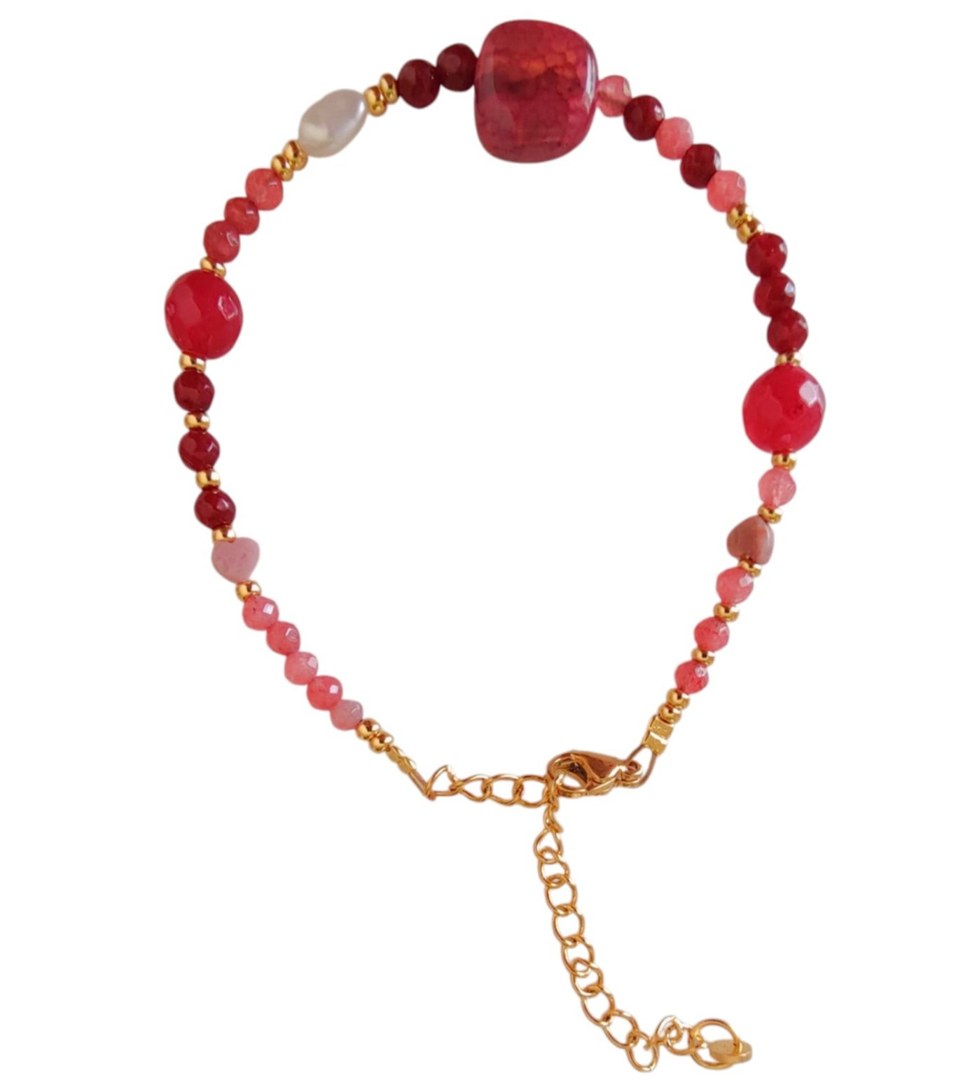 Maak je outfit af met deze stijlvolle armband. Handgemaakt van prachtige natuurstenen kralen, afgewisseld met vergulde kralen. Een kleurencombinatie die perfect past bij de trends van dit najaar. De sluiting is gemaakt van stainless steel en daardoor kleurvast.