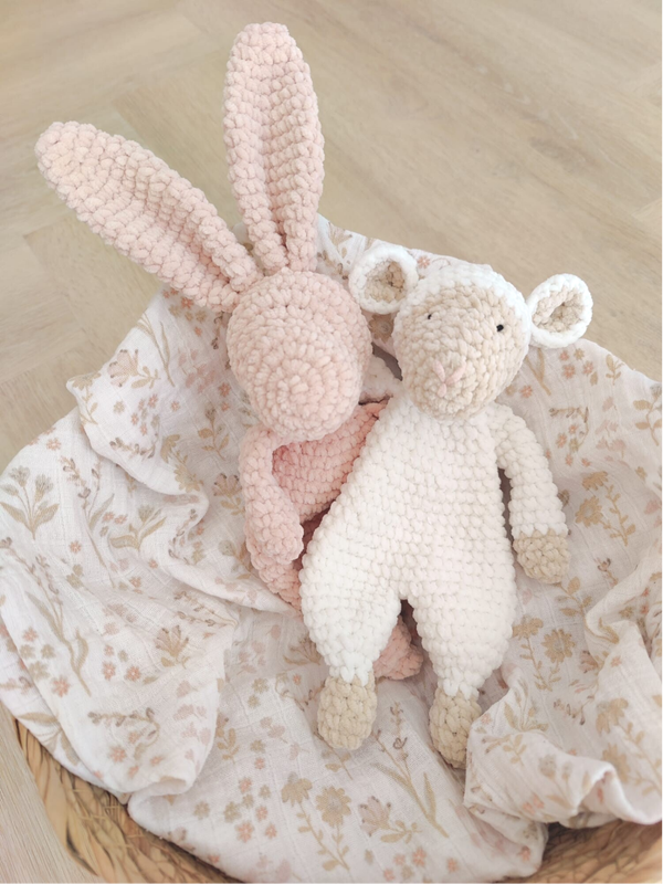 Het garen waarmee dit schaapje is gehaakt, is zo heerlijk zacht. Het knuffel schaapje is gemaakt met Durable Velvet garen. Het schaapje heeft geborduurde oogjes, dat betekent dat er geen kleine onderdelen zijn gebruikt bij het maken van deze knuffel. Dit lieve schaapje is ca. 24 cm lang. Door het formaat van de knuffel is het goed vast te houden voor kleine babys. Een ideaal kraamcadeau dus!
