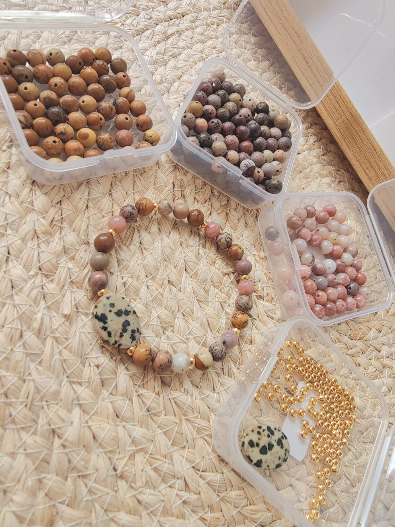 Tijdens de sieraden maken workshop werken we met verschillende technieken. Denk bijvoorbeeld aan het rijgen op draad of juist en knopen van een macramé armbandje. We gebruiken materialen zoals facet kralen, natuursteen, stainless steel en vergulde kralen. Je bent vrij om te kiezen welke materialen en kleuren je wilt gebruiken. Zo wordt het echt jou eigen unieke sieraad!